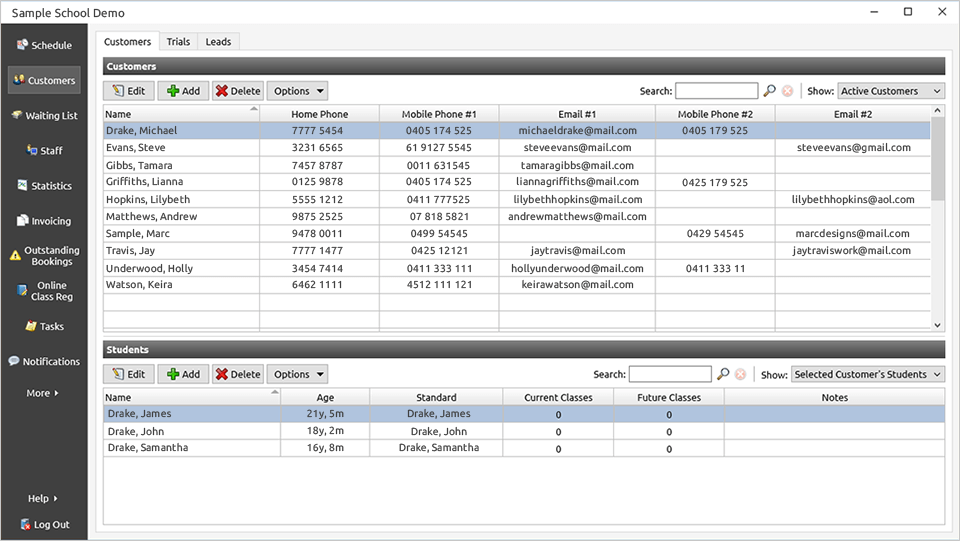 SwimBiz will keep your customer and student details organised. Our intuitive interface enables you and your staff to add and edit customers and students. Both customers and students can be made inactive when they no longer attend classes, keeping their information on file as historical records. Customers can also be divided into categories for easy access.